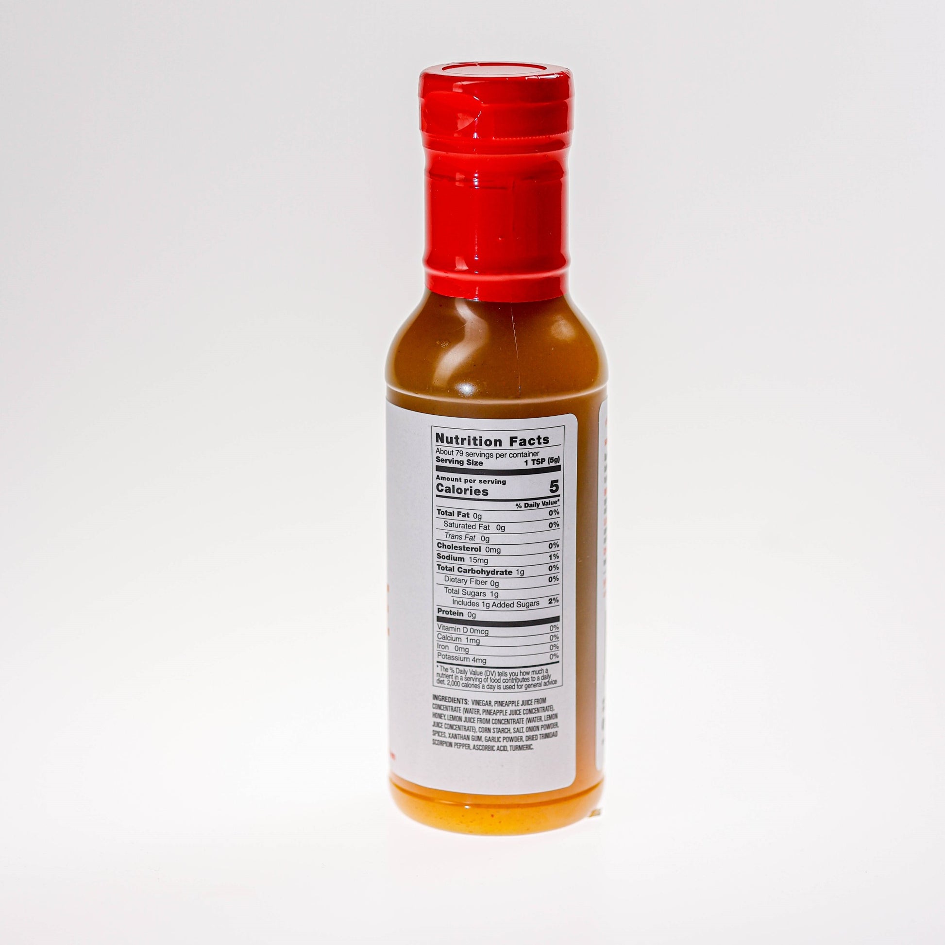 Ingredients: VINEGAR, PINEAPPLE JUICE FROM CONCENTRATE (WATER, PINEAPPLE JUICE CONCENTRATE), HONEY, LEMON JUICE FROM CONCENTRATE (WATER, LEMON JUICE CONCENTRATE), CORN STARCH, SALT, ONION POWDER, SPICES, XANTHAN GUM, GARLIC POWDER, DRIED TRINIDAD SCORPION PEPPER, ASCORBIC ACID, TURMERIC.